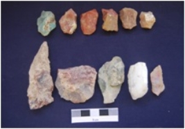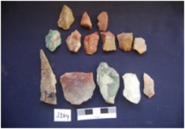 | Description / विवरण | Total No. of Debitage 14. Flakes and chunks, resulted from the stone tool manufacturing, made on Chert and Quartz. A few flakes have preapred platform whereas the others with narrow platform. |