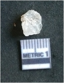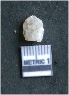 | Description / विवरण | The quartz flake has sharp flaked edges and pointed ends as a result of flaking. The piece is semi-transparent in nature with irregular fracture pattern. The piece is roughly triangular in shape and has a prominent bulb of percussion. |