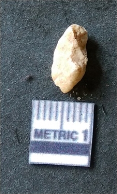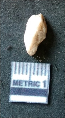 | Description / विवरण | The quartz flake has sharp flaked edges and pointed ends as a result of flaking. The piece is semi-transparent in nature with irregular fracture pattern. The piece is roughly triangular in shape and has a prominent bulb of percussion. |