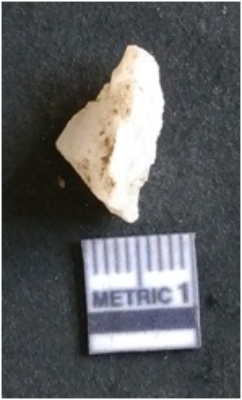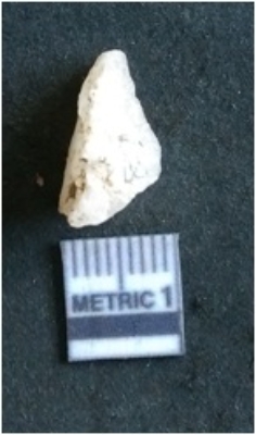 | Description / विवरण | The quartz flake has sharp flaked edges and pointed ends as a result of flaking. The piece is semi-transparent in nature with irregular fracture pattern. The piece is roughly triangular in shape and has a prominent bulb of percussion. |