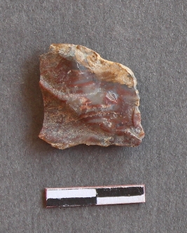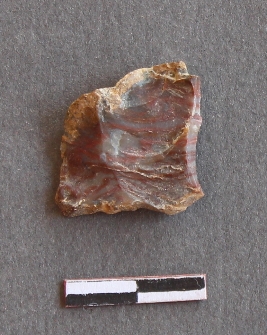 | Description / विवरण | It s a jasper fragment, with bulb of percussion on ventral side of the fragment. Flake ridges on the surface. It s a banded agate and translucent in appearance. |