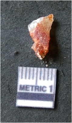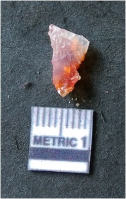 | Description / विवरण | It is carnelian flake red in color, with sharp flakes edges and a small bulb of percussion owing to knapping activity. The piece has sharp flaked edges and a crypto-crystalline matrix. |