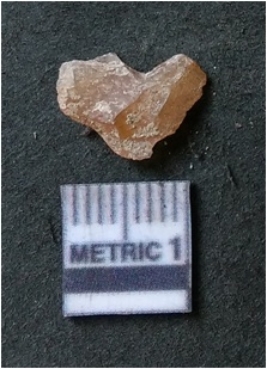 | Description / विवरण | The flake has irregular fracture pattern and sharp flaked edges as a result of lithic knapping activity. The piece is pale, with surfacial flake scars and a bulbous end. The quartz flake is rosy white in colour. |