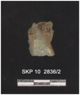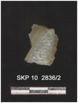| Description / विवरण | It is of quartz. The ridges can be clearly seen; the striking platform and the bulb percussion can be seen. The sides are retouched. |