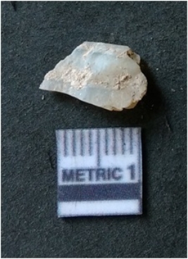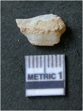 | Description / विवरण | The quartz flake has sharp flaked edges and pointed ends as a result of flaking. The piece is semi-transparent in nature with irregular fracture pattern. The piece is roughly triangular in shape and has a prominent bulb of percussion. |