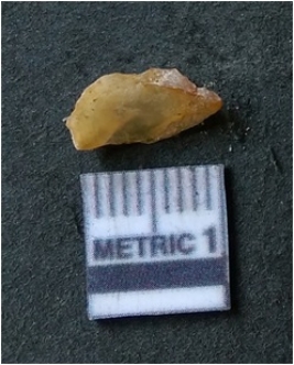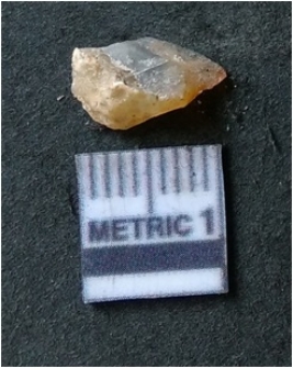 | Description / विवरण | It is chalcedony flake, translucent in appearance. The piece shows sharp pointed ends and flake scars on the surface as a result of flaking. The piece shows a bulb of percussion. |