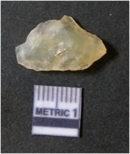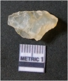 | Description / विवरण | The quartz flake has sharp flaked edges and pointed ends as a result of flaking. The piece is semi-transparent in nature with irregular fracture pattern. The piece is roughly triangular in shape and has a prominent bulb of percussion. |