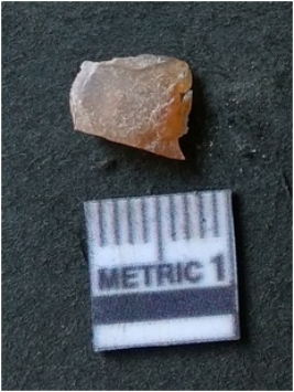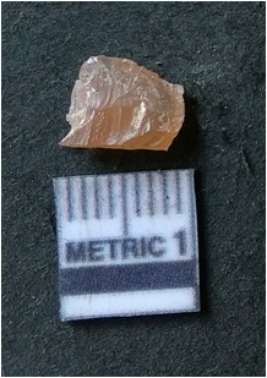 | Description / विवरण | It is chalcedony flake, translucent in appearance. The piece shows sharp pointed ends and flake scars on the surface as a result of flaking. The piece shows a bulb of percussion. |
