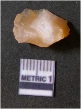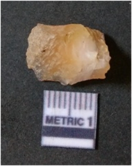 | Description / विवरण | The milky quartz flake has irregular fracture pattern and sharp flaked edges as a result of lithic knapping activity. The piece is pale, with surfacial flake scars and a bulbous end. The flake is white in color. |