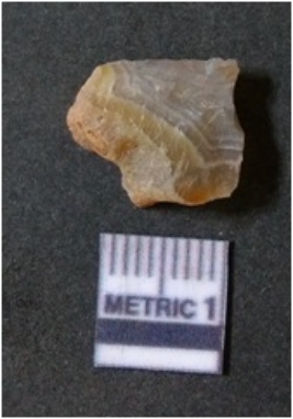| Description / विवरण | The banded agate piece is crystalline in nature, with a smooth fracture pattern and visible bands on the flaked sides. The piece is pale in color and has sharp flaked ends. |