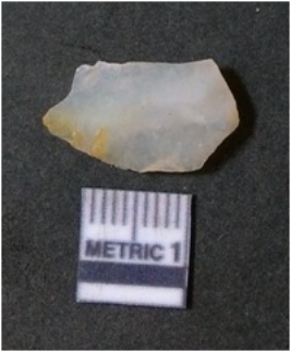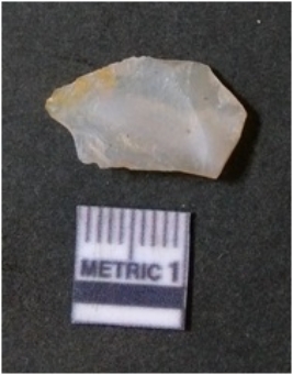 | Description / विवरण | The quartz flake has sharp flaked edges and pointed ends as a result of flaking. The piece is semi-transparent in nature with irregular fracture pattern. The piece is roughly triangular in shape and has a prominent bulb of percussion. |