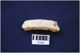 | Description / विवरण | A piece of shell bangle manufacturing waste. Glossy interior. Many worm infestation holes. |