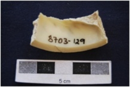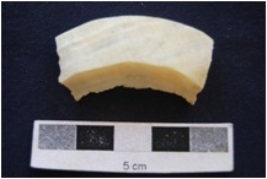 | Description / विवरण | A piece of shell bangle manufacturing waste. Glossy interior. |