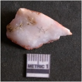 | Description / विवरण | The quartz flake has sharp flaked edges and pointed ends as a result of flaking. The piece is semi-transparent in nature with irregular fracture pattern. The piece is roughly triangular in shape and has a prominent bulb of percussion. |