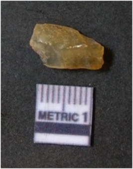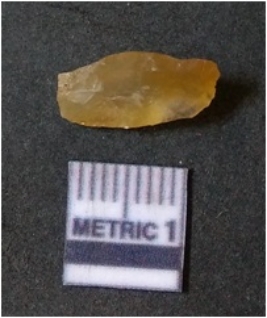 | Description / विवरण | It is chalcedony flake, translucent in appearance. The piece shows sharp pointed ends and flake scars on the surface as a result of flaking. The piece shows a bulb of percussion. |