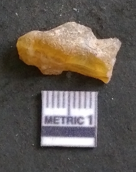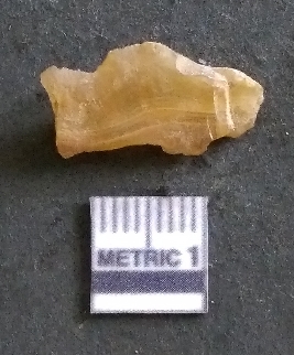 | Description / विवरण | It is a chalcedony flake, with a bulb of percussion on the ventral side. Cortex on one end. |