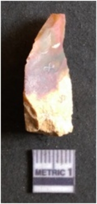 | Description / विवरण | The flake is elongated with sharp flake scars on the surface. The flake has a rough triangular cross section and a prominent bulb of percussion on a result of flaking. |