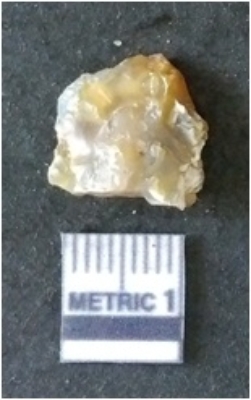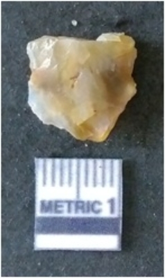 | Description / विवरण | It is chalcedony flake, translucent in appearance. The piece shows sharp pointed ends and flake scars on the surface as a result of flaking. The piece shows a bulb of percussion. |