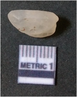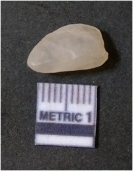| Description / विवरण | The quartz flake has sharp flaked edges and pointed ends as a result of flaking. The piece is semi-transparent in nature with irregular fracture pattern. The piece is roughly triangular in shape and has a prominent bulb of percussion. |