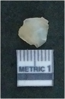 | Description / विवरण | The flake has irregular fracture pattern and sharp flaked edges as a result of lithic knapping activity. The piece is pale, with surfacial flake scars and a bulbous end. |
