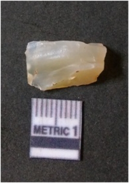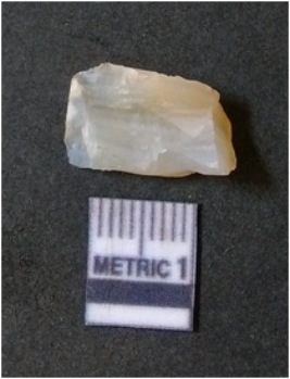| Description / विवरण | The quartz flake has sharp flaked edges and pointed ends as a result of flaking. The piece is semi-transparent in nature with irregular fracture pattern. The piece is roughly triangular in shape and has a prominent bulb of percussion. |