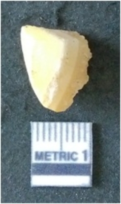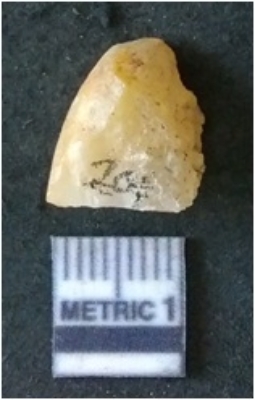 | Description / विवरण | It is chalcedony flake, translucent in appearance. The piece shows sharp pointed ends and flake scars on the surface as a result of flaking. The piece shows a bulb of percussion. |