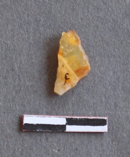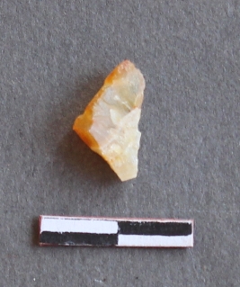 | Description / विवरण | It is a carnelian flake, with a striking platform with bulb of percussion on the ventral side. It is orangish in color, flake edges on the surface with ripple on it due to heavy percussion. |
