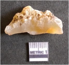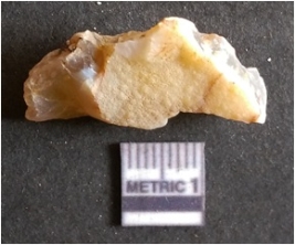 | Description / विवरण | The has a sharp edges as a result of lithic knapping and rough crescent shape. The piece is crypto crystalline in nature and translucent in appearance. |