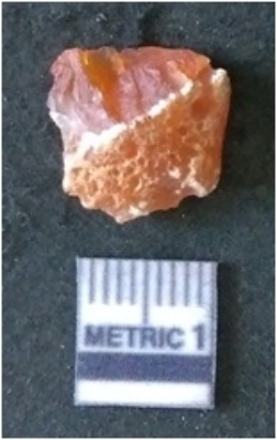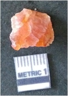 | Description / विवरण | It is carnelian flake red in color, with sharp flakes edges and a small bulb of percussion owing to knapping activity. The piece has sharp flaked edges and a crypto-crystalline matrix. |