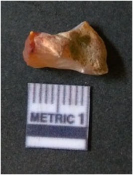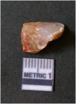 | Description / विवरण | It is chalcedony flake, translucent in appearance. The piece shows sharp pointed ends and flake scars on the surface as a result of flaking. The piece shows a bulb of percussion. |