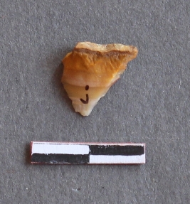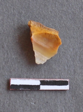 | Description / विवरण | It is a chalcedony flake, with a striking platform with bulb of percussion on the ventral side. It is yellowish in color, flake edges on the surface with ripple on it due to heavy percussion. Cortex on the surface. |