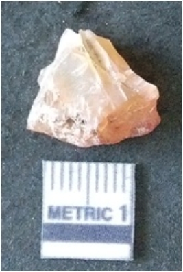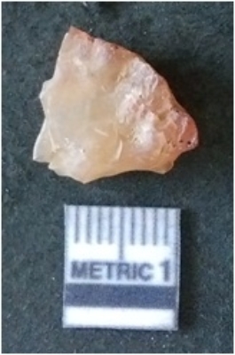| Description / विवरण | It is chalcedony flake, translucent in appearance. The piece shows sharp pointed ends and flake scars on the surface as a result of flaking. The piece shows a bulb of percussion. |