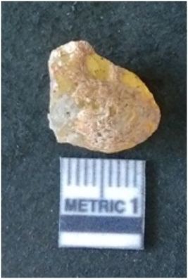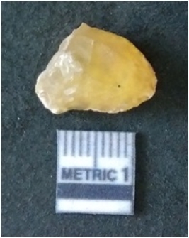 | Description / विवरण | It is chalcedony flake, translucent in appearance. The piece shows sharp pointed ends and flake scars on the surface as a result of flaking. The piece shows a bulb of percussion. |