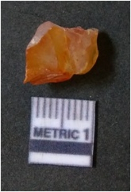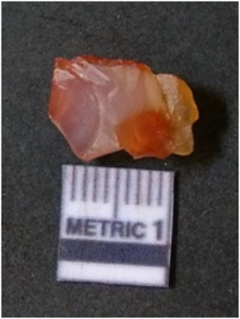 | Description / विवरण | It is carnelian flake red in color, with sharp flakes edges and a small bulb of percussion owing to knapping activity. The piece has sharp flaked edges and a crypto-crystalline matrix. |