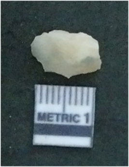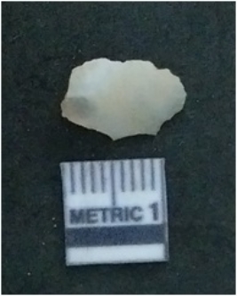 | Description / विवरण | The flake has irregular fracture pattern and sharp flaked edges as a result of lithic knapping activity. The piece is pale, with surfacial flake scars and a bulbous end. |