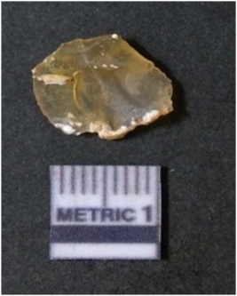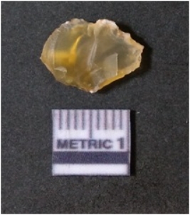 | Description / विवरण | It is chalcedony flake, translucent in appearance. The piece shows sharp pointed ends and flake scars on the surface as a result of flaking. The piece shows a bulb of percussion. |