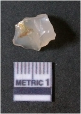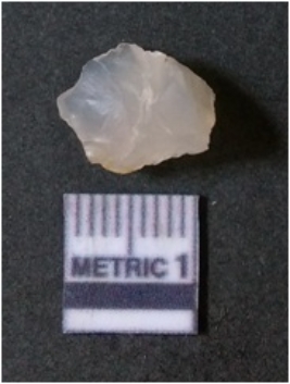| Description / विवरण | The quartz flake has sharp flaked edges and pointed ends as a result of flaking. The piece is semi-transparent in nature with irregular fracture pattern. The piece is roughly triangular in shape and has a prominent bulb of percussion. |