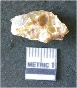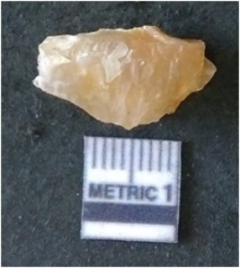 | Description / विवरण | It is chalcedony flake, translucent in appearance. The piece shows sharp pointed ends and flake scars on the surface as a result of flaking. The piece shows a bulb of percussion. |