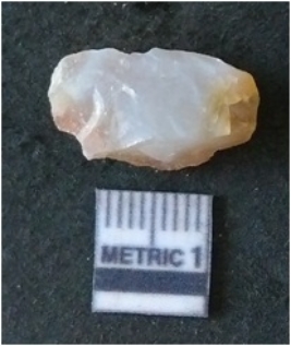| Description / विवरण | The quartz flake has sharp flaked edges and pointed ends as a result of flaking. The piece is semi-transparent in nature with irregular fracture pattern. The piece is roughly triangular in shape and has a prominent bulb of percussion. |