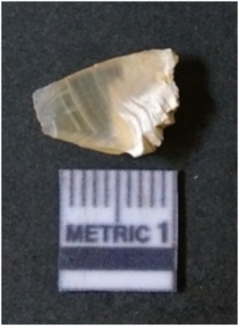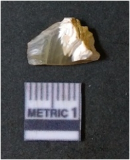 | Description / विवरण | It is chalcedony flake, translucent in appearance. The piece shows sharp pointed ends and flake scars on the surface as a result of flaking. The piece shows a bulb of percussion. |
