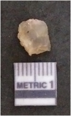 | Description / विवरण | The chalcedony flake is pale in colour and translucent in appearance. The piece has s harp flaked ends and a bulbous end due to flaking. The flake has a crypto-crystalline silica matrix. |