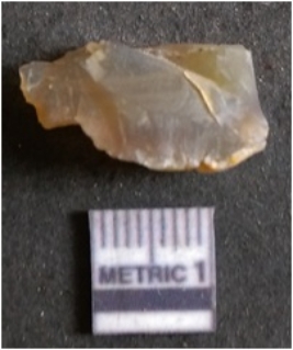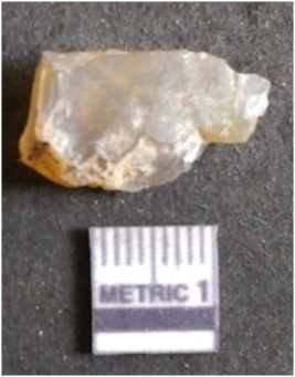 | Description / विवरण | The smoky quartz flake has sharp flaked edges and pointed ends as a result of flaking. The piece is semi-transparent in nature with irregular fracture pattern. The piece is roughly triangular in shape and has a prominent bulb of percussion. |