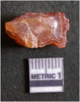 | Description / विवरण | It is carnelian flake red in color, with sharp flakes edges and a small bulb of percussion owing to knapping activity. The piece has sharp flaked edges and a crypto-crystalline matrix. |
