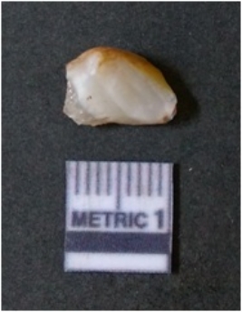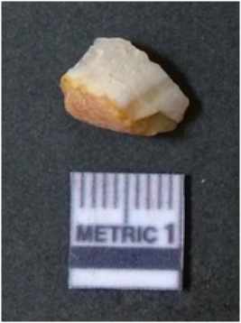 | Description / विवरण | The quartz flake has sharp flaked edges and pointed ends as a result of flaking. The piece is semi-transparent in nature with irregular fracture pattern. The piece is roughly triangular in shape and has a prominent bulb of percussion. |