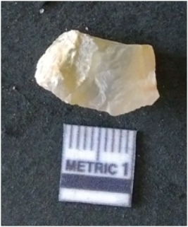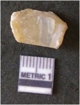 | Description / विवरण | It is chalcedony flake, translucent in appearance. The piece shows sharp pointed ends and flake scars on the surface as a result of flaking. The piece shows a bulb of percussion. |