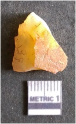 | Description / विवरण | The quartz flake has sharp flaked edges and pointed ends as a result of flaking. The piece is semi-transparent in nature with irregular fracture pattern. The piece is roughly triangular in shape and has a prominent bulb of percussion. |