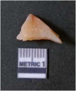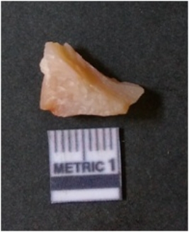 | Description / विवरण | The flake has irregular fracture pattern and sharp flaked edges as a result of lithic knapping activity. The piece is pale, with surfacial flake scars and a bulbous end. The quartz flake is rosy white in colour. |