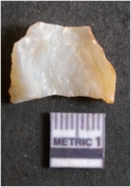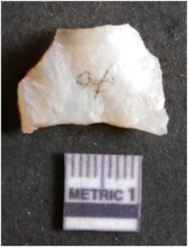 | Description / विवरण | The quartz flake has sharp flaked edges and pointed ends as a result of flaking. The piece is semi-transparent in nature with irregular fracture pattern. The piece is roughly triangular in shape and has a prominent bulb of percussion. |