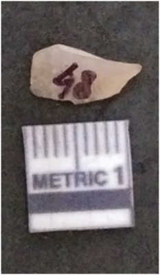 | Description / विवरण | The chalcedony flake is pale in colour and translucent in appearance. The piece has s harp flaked ends and a bulbous end due to flaking. The flake has a crypto-crystalline silica matrix. |