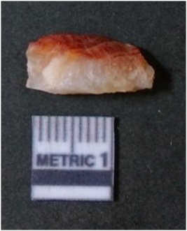 | Description / विवरण | The quartz flake has sharp flaked edges and pointed ends as a result of flaking. The piece is semi-transparent in nature with irregular fracture pattern. The piece is roughly triangular in shape and has a prominent bulb of percussion. |